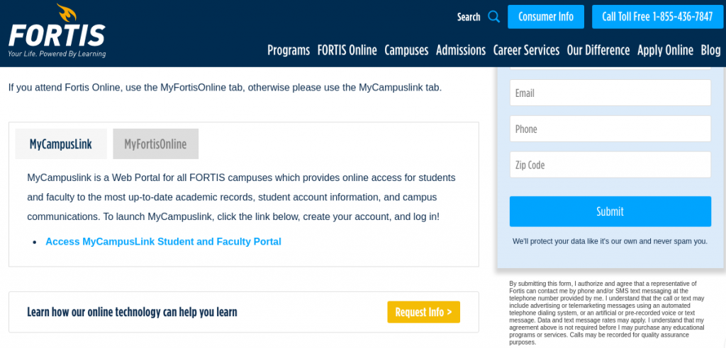 - Open the website of the Fortis College Student Portal. www.fortis.edu/our-difference/mycampuslink-portal